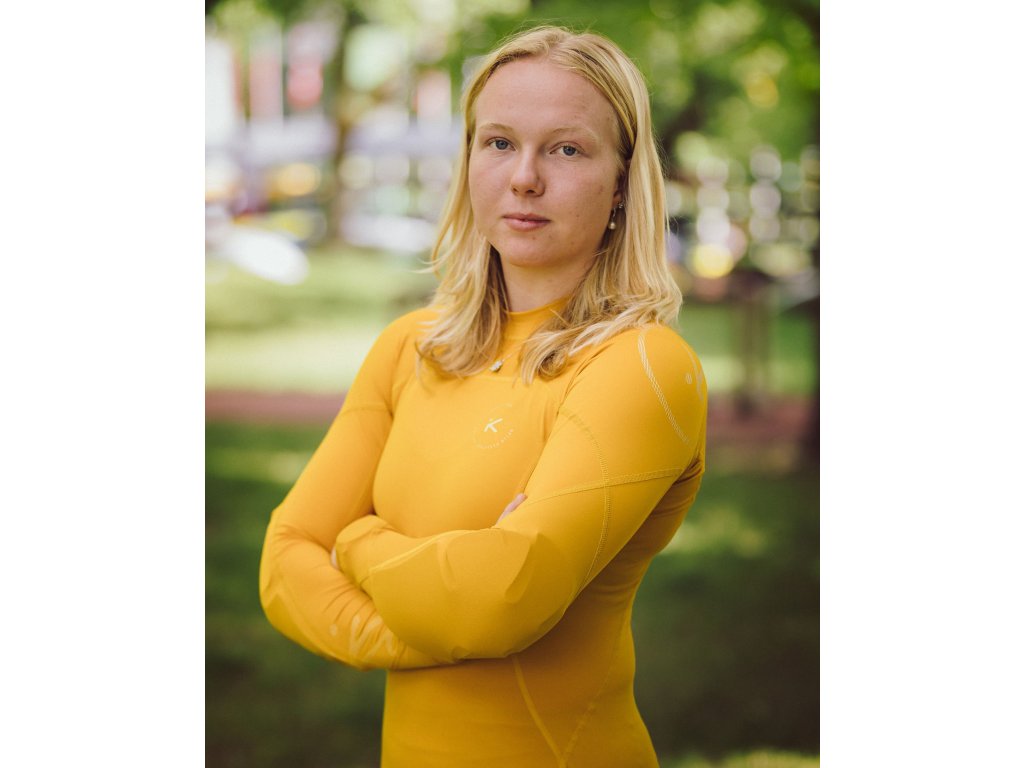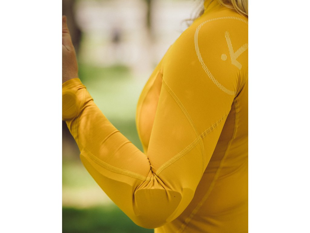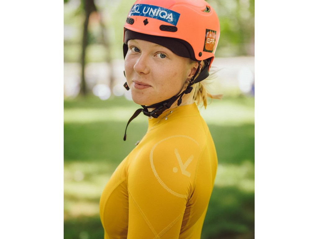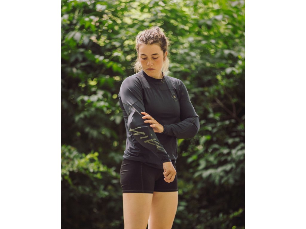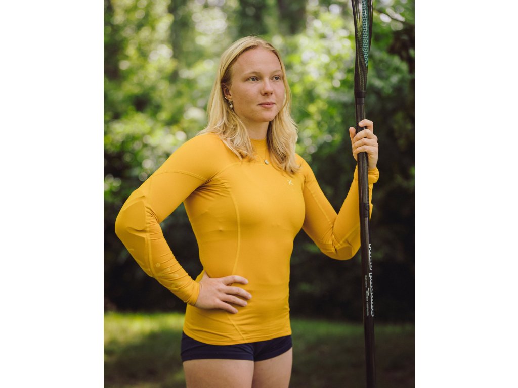 Recyklovaný polyester vyrobený v Itálii. Vnitřní hebká vrstva dělá materiál velmi příjemným na dotek. Multifunkční materiál je vhodný jak pro pádlování na přímém slunci tak jako základní vrstva pod suchou bundu. Rychleschnoucí materiál. Chrániče, které jsou součástí rukávu, umožňují zachovat plný rozsah pohybu a okysličování svalů. Absence stahovacích popruhů zajišťuje delší životnost vybavení, které přichází s chrániči do kontaktu. Dámský střih.