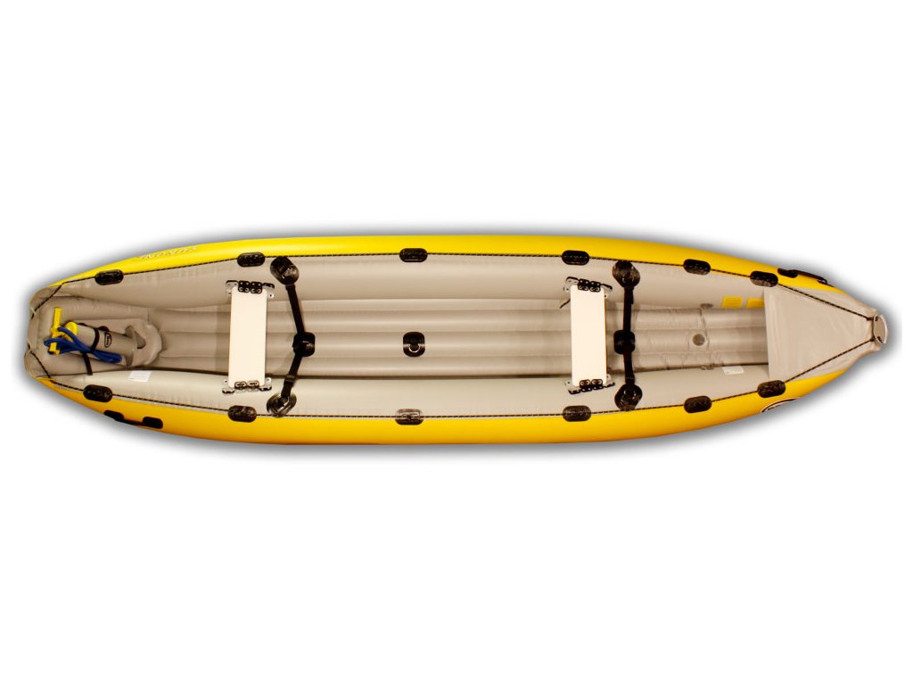 - samovylévání vody zajišťuje rukáv v zadní části kánoe; na klidných vodách jej lze uzavřít a získat tak suchou loď