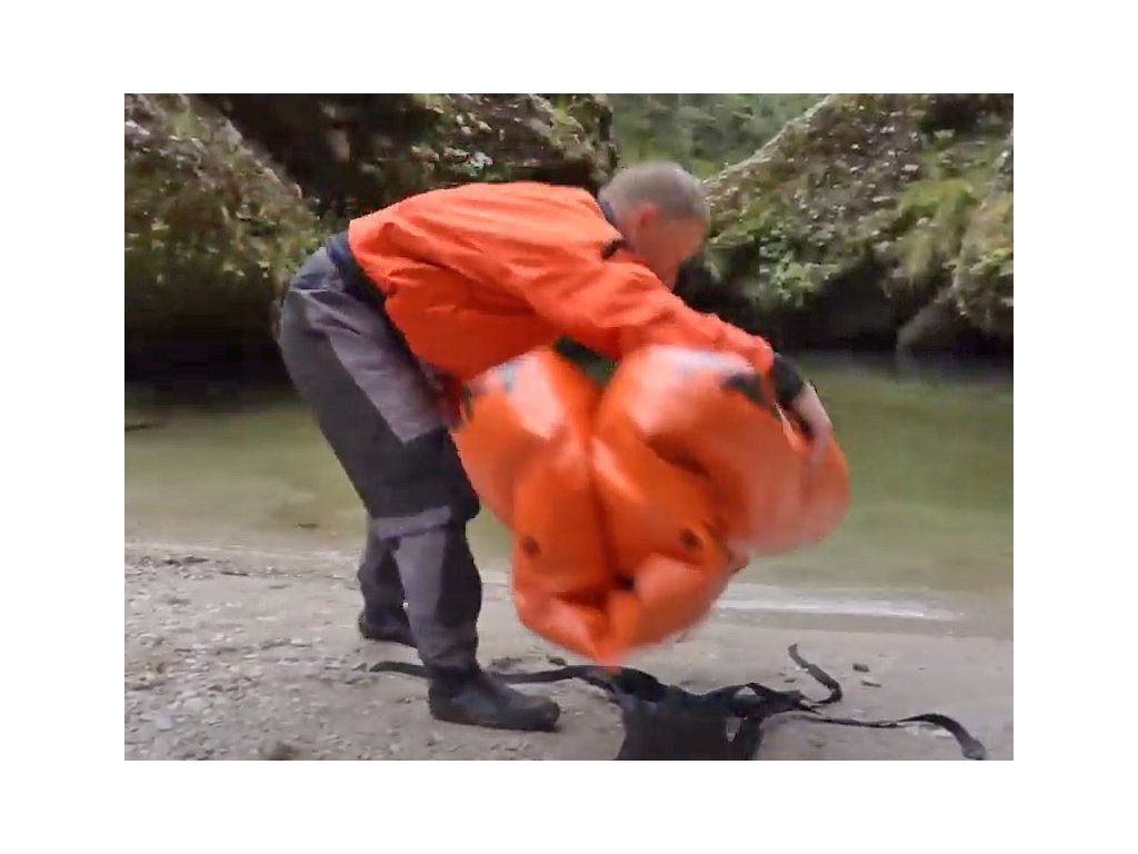 - packraft se vyfoukne, přeloží a zaváže do postroje jako do usárny