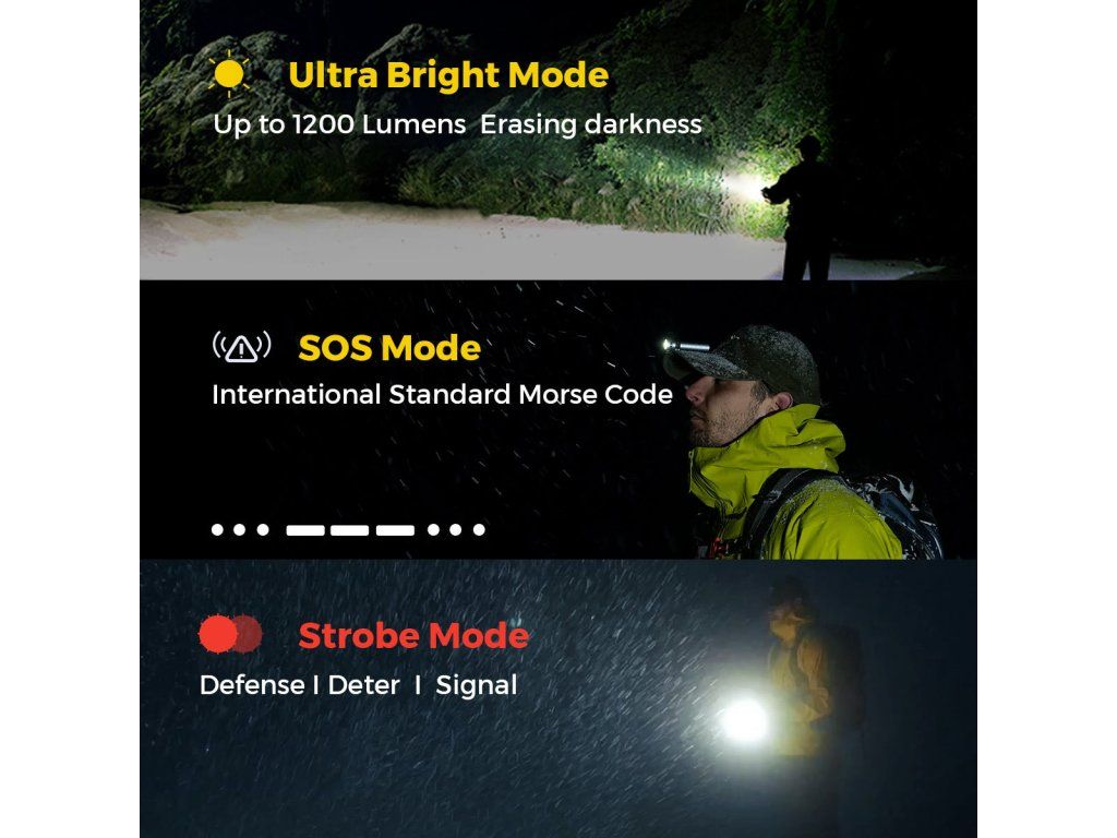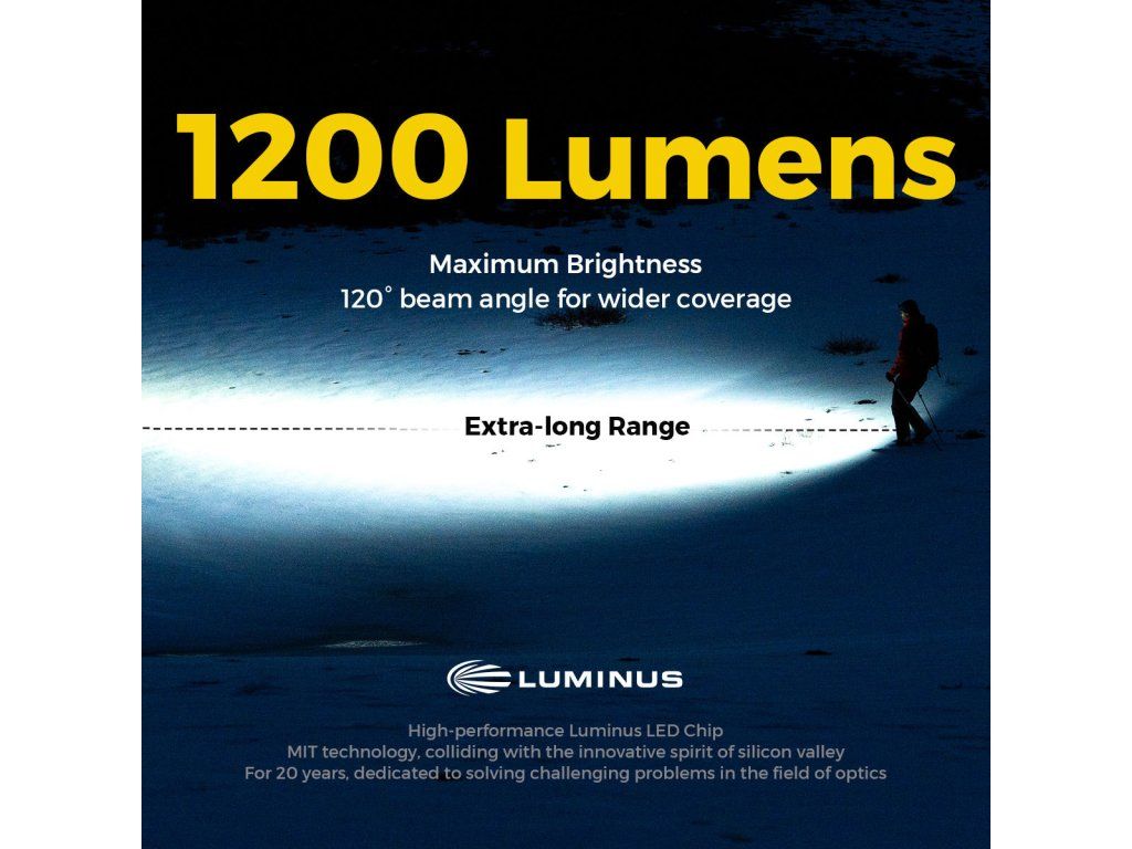 - Ultravysoký jas: Až 1200 lm, zažene tmu