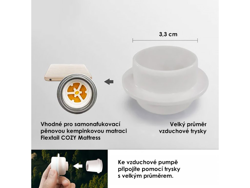 - Ke vzduchové pumpě připojíte pomocí trysky s velkým průměrem. Pumpu s redukcí pak přiložíte k ventilu matrace.
